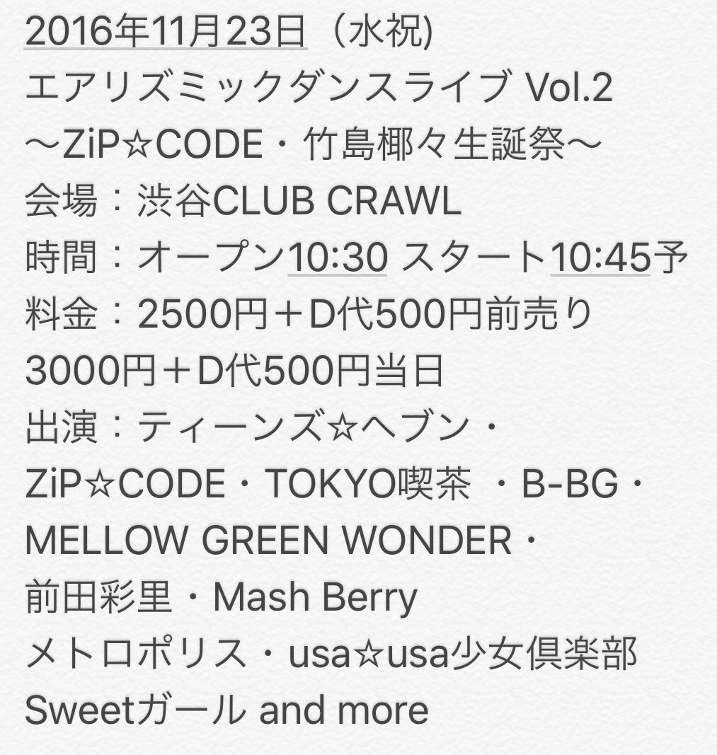 « All Events This event has passed. エアリズミックダンスライブ Vol.2 〜ZiP☆CODE・竹島椰々生誕祭〜 2016年11月23日 @ 10:30 AM - 10:30 PM « 『LIVE at アイドルネオン!』Vol.36 LIVEプラス@渋谷Glad » 会場:渋谷CLUB CRAWL 時間:OP10:30 ST10:45予定 料金:2500円+D代前売り3000円+D代当日 0 + Google Calendar+ iCal Export Details Date: 2016年11月23日 Time: 10:30 AM - 10:30 PM Event Categories: usa☆usa少女倶楽部, ZiP☆CODE, ティーンズ☆ヘブン, ライブ予定 B! LINEへ送る