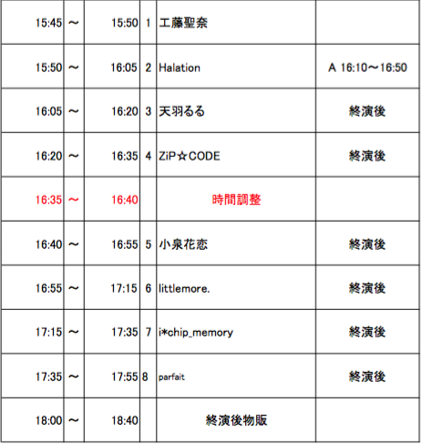 « All Events This event has passed. 工藤聖奈生誕祭1部〜大人の階段登る聖奈はもう18歳〜 2017年3月26日 @ 3:30 PM « LIVEプラス@渋谷ジーカンズ ライブプラス 中野坂上SUB TOKYO » 3月26日(日) 夕方【工藤聖奈生誕祭1部〜大人の階段登る聖奈はもう18歳〜】 ■会場:渋谷RUIDO K2 ■時間:15:30 open / 15:45 start ■料金:前売り¥1,500 / 当日¥2.000 (各D代別) ■出演:parfait / i*chip_memory / littlemore. / 小泉花恋 / Halation / ZiP☆CODE / 天羽るる 0 + Google Calendar+ iCal Export Details Date: 2017年3月26日 Time: 3:30 PM Event Categories: ZiP☆CODE, ライブ予定 Venue 渋谷 Ruido K2 B! LINEへ送る