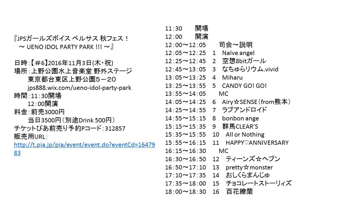 « All Events This event has passed. JPSガールズボイス ベルサス 秋フェス! 〜 UENO IDOL PARTY PARK !!! 〜 2016年11月3日 @ 11:30 AM « IDOLidge presents~FREE BOMBER!!~ LIVEプラス@渋谷Glad » 日時:【#6】2016年11月3日(木・祝) 場所:上野公園水上音楽堂 野外ステージ 0 + Google Calendar+ iCal Export Details Date: 2016年11月3日 Time: 11:30 AM Event Categories: ティーンズ☆ヘブン, ライブ予定 B! LINEへ送る